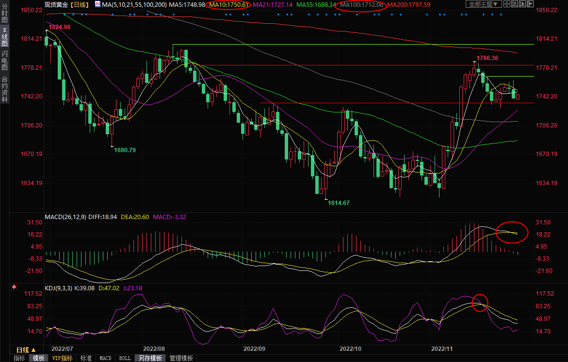 整体来看,尽管地缘局势担忧和全球经济衰退还吸引逢低买盘支撑,上方留意10日均线1750关口附近阻力,但美联储官员的鹰派讲话给美元提供支撑,对金价形成打压,美元的探底回升甚至令金价面临进一步回调风险,下方关注1616-1786涨势的38.2%回撤位1721.91和100日均线1712.07附近支撑。当然,对于中线走势,投资者本周需要重点关注美联储主席鲍威尔的讲话、美国10月PCE数据和非农就业报告的表现。北京时间10:00,