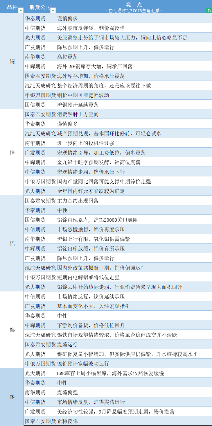 标题:期货公司观点汇总一张图:8月30日有色系(铜、锌、铝、镍、锡等)