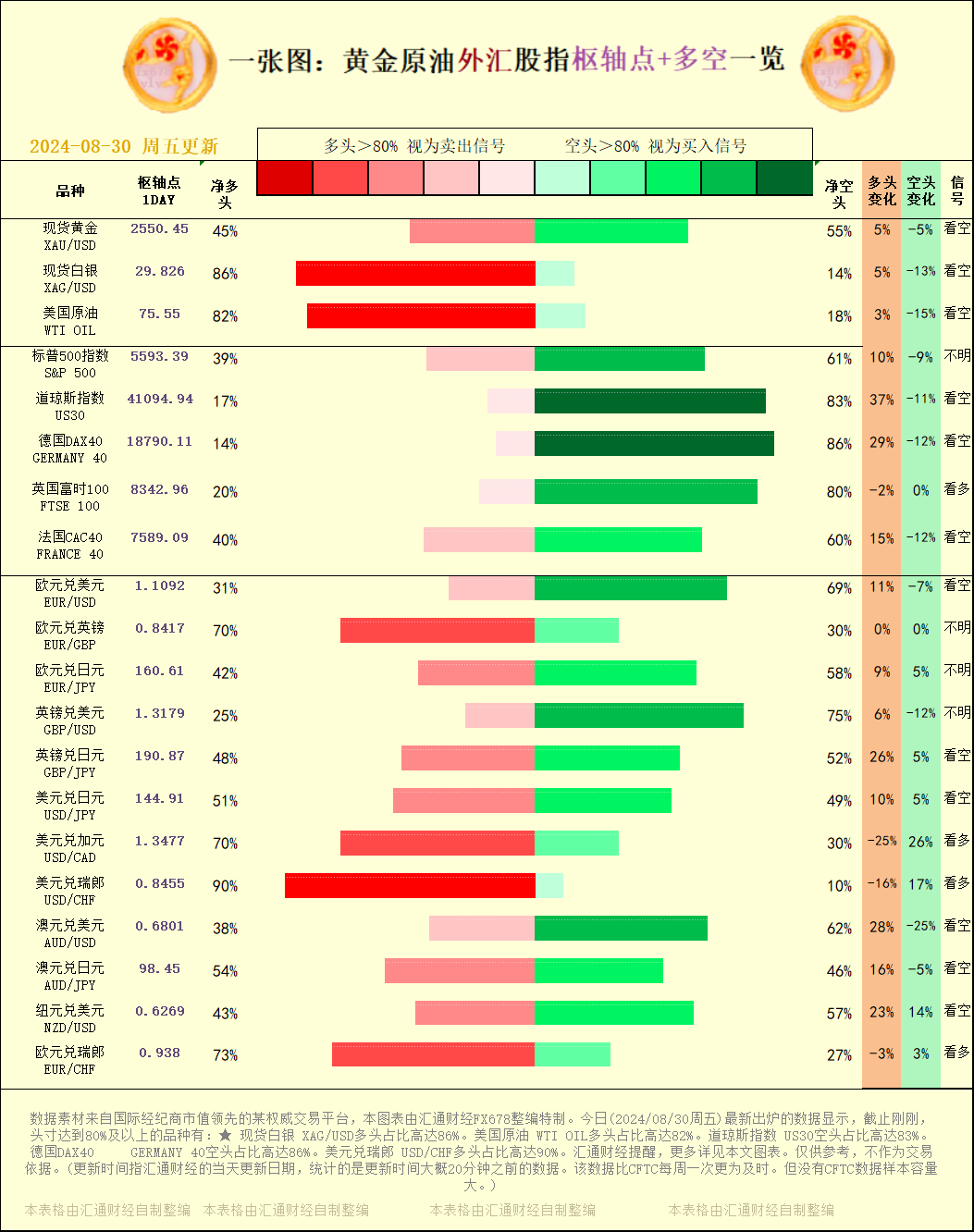 标题:一张图:2024/08/30黄金原油外汇股指"枢纽点+多空占比"一览