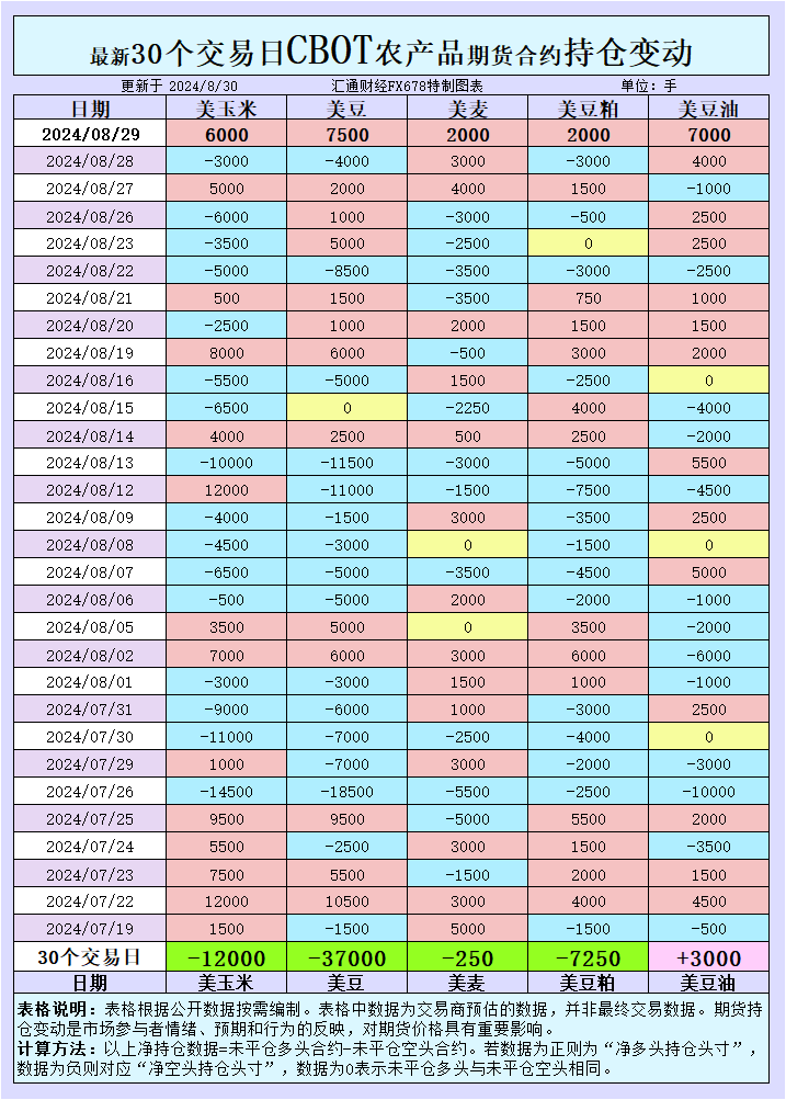 在过去的30个交易日内,大宗商品基金在CBOT大豆市场上增加了投机性净空头。然而,在8月29日的最新交易中,市场又出现了投机性净多头的增加。这一变化反映出市场情绪的复杂性:一方面,尽管有迹象表明美国大豆可能会迎来丰收,但另一方面,市场对全球需求复苏的预期也在支撑价格。