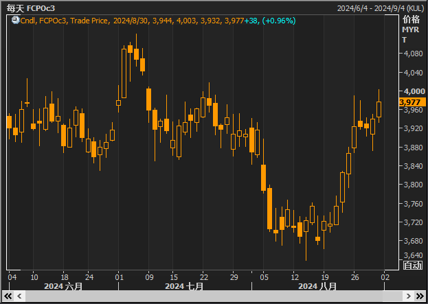 马来西亚棕榈油期货在周五连续第二个交易日上涨,基准棕榈油合约(11月交割)收盘上涨38林吉特,至每吨3978林吉特(约920.83美元),涨幅0.96%。这一上涨幅度使得该合约周环比上涨2.87%,月环比上涨1.79%,标志着自6月份以来的首次月度上涨。