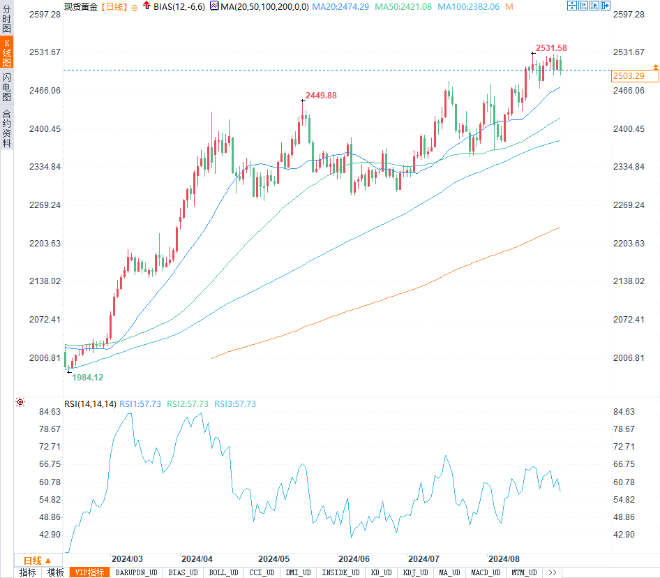 市场对美联储政策的预期在不断变化。根据芝加哥商品交易所的FedWatch工具,交易员对美联储下个月降息25个基点的预期略有上升至69%,而降息50个基点的可能性降至31%。这一预期对黄金市场产生了双重影响:一方面,宽松政策预期支撑了黄金的避险需求;另一方面,美元和美债收益率的上升则对黄金价格形成了压力。