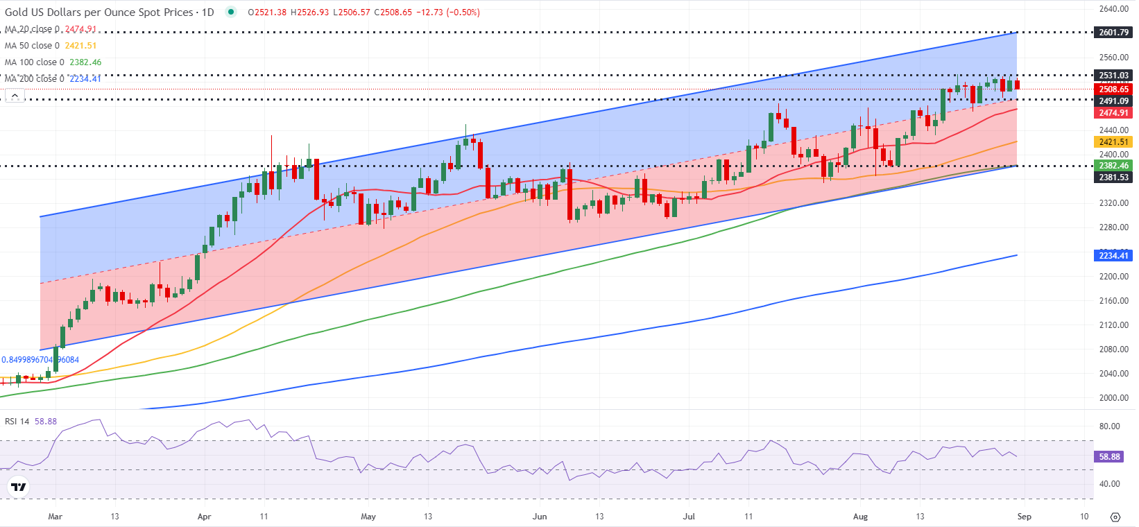 本周黄金价格收盘小幅下跌,但仍保持在2500美元/盎司的关键心理水平上方。技术分析显示,黄金短期内的看涨倾向仍未改变。FXStreet分析师Eren Sengezer指出,尽管美元的复苏对黄金价格形成了压力,但黄金价格成功稳定在2500美元/盎司上方,显示出一定的抗跌能力。