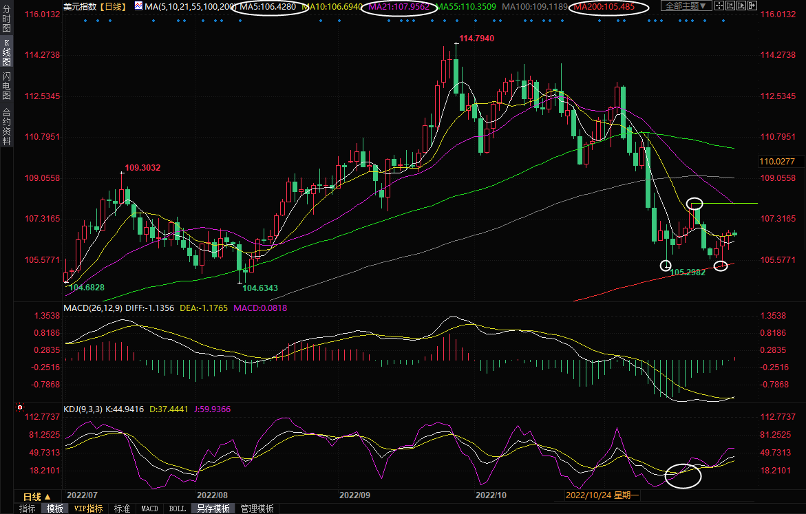 美元指数周二先跌后涨,连续三个交易日收涨,且守住了200日均线关键支撑,过去两个交易日录得带下影线的阳线,暗示下方买盘较强,MACD初步金叉,