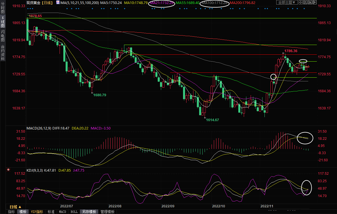 整体来看,金价短线走势变数较大,投资者需要密切关注本交易日出炉的经济数据和美联储主席鲍威尔的讲话。由于本周多位美联储官员发表鹰派讲话,短线美元和美债收益率存在进一步反弹机会,金价也连续三个交易日录得带上影线的K线,暗示上方卖压较强,短线金价面临进一步回调风险,关注21日均线1732.25和11月9日高点1722.24附近支撑,强支撑在100日均线附近,在跌破100日均线1712.8前,中线依然偏向多头。如果上破周一高点1763.63附近阻力,则增加短线看涨信号。北京时间10:26,