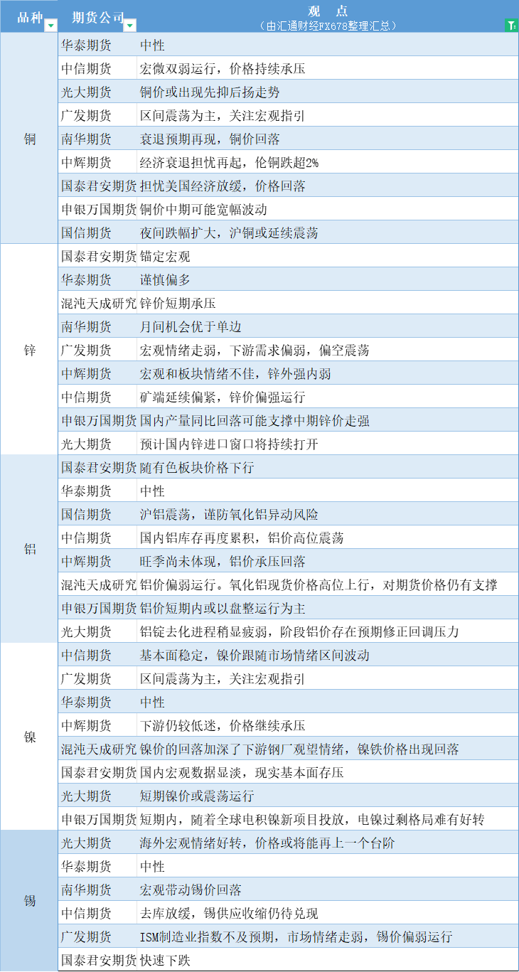 标题:期货公司观点汇总一张图:9月4日有色系(铜、锌、铝、镍、锡等)