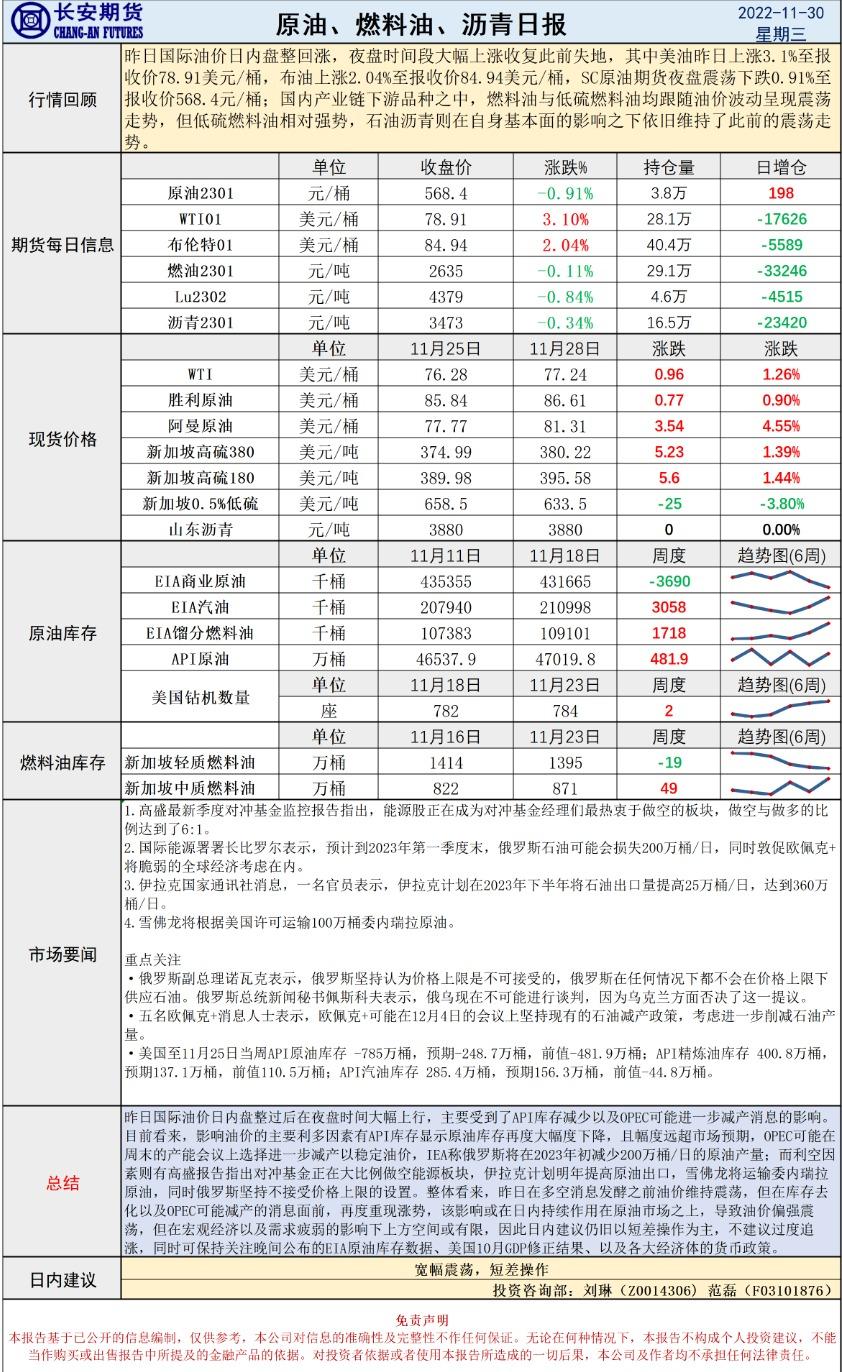 11月30日,长安期货发布原油早评,认为原油将宽幅震荡,建议短差操作。