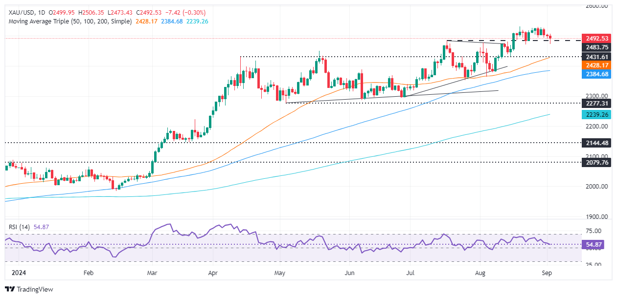 截至周二收盘,现货黄金报2492.65美元/盎司,日内下跌近0.3%。