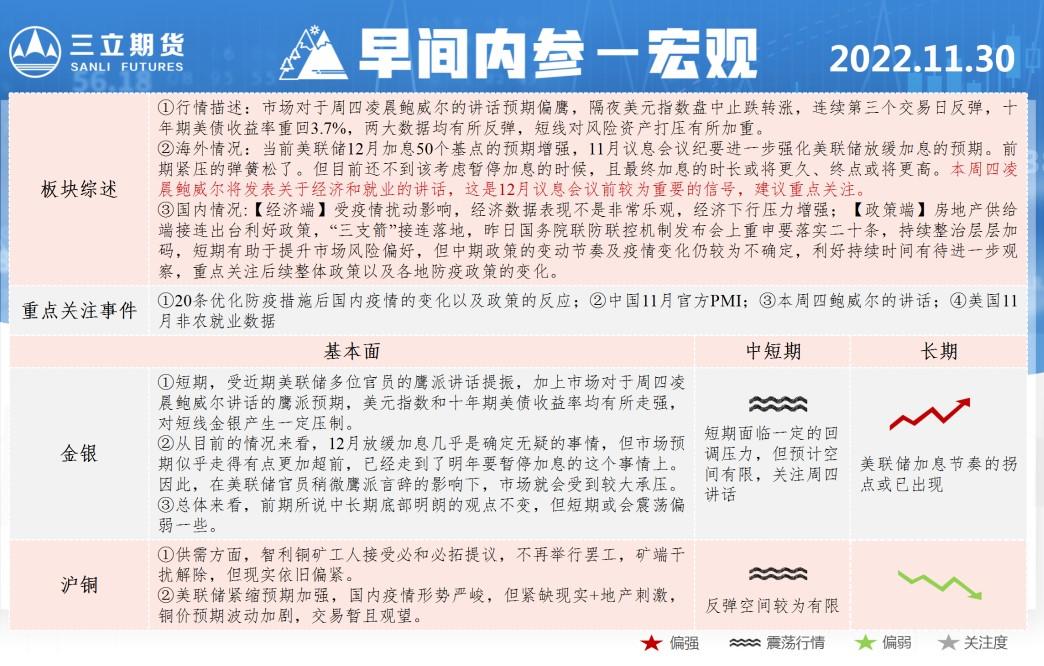 三立期货早间内参显示,金银中短线震荡,短线面临一定的回调压力,但预计回调空间有限,关注美联储主席鲍威尔将近;长线偏多,美联储加息节奏的拐点或已出现;沪铜中短线偏向震荡,反弹空间较为有限,长线偏空。