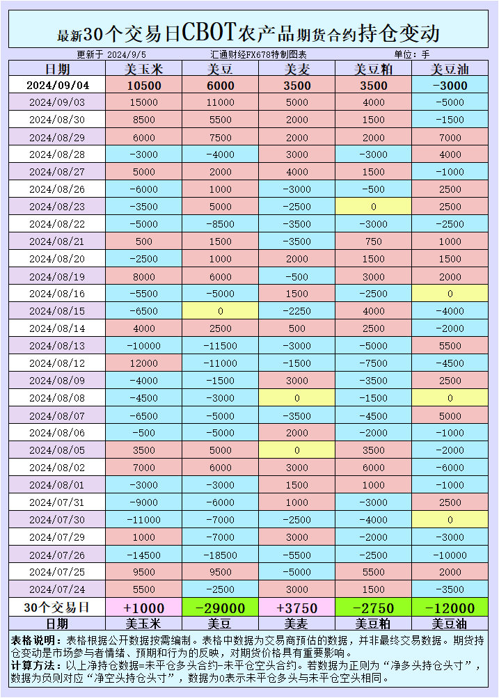 增加CBOT玉米投机性净多头;增加CBOT大豆投机性净多头;增加CBOT小麦投机性净多头;增加CBOT豆粕投机性净多头;增加CBOT豆油投机性净空头。