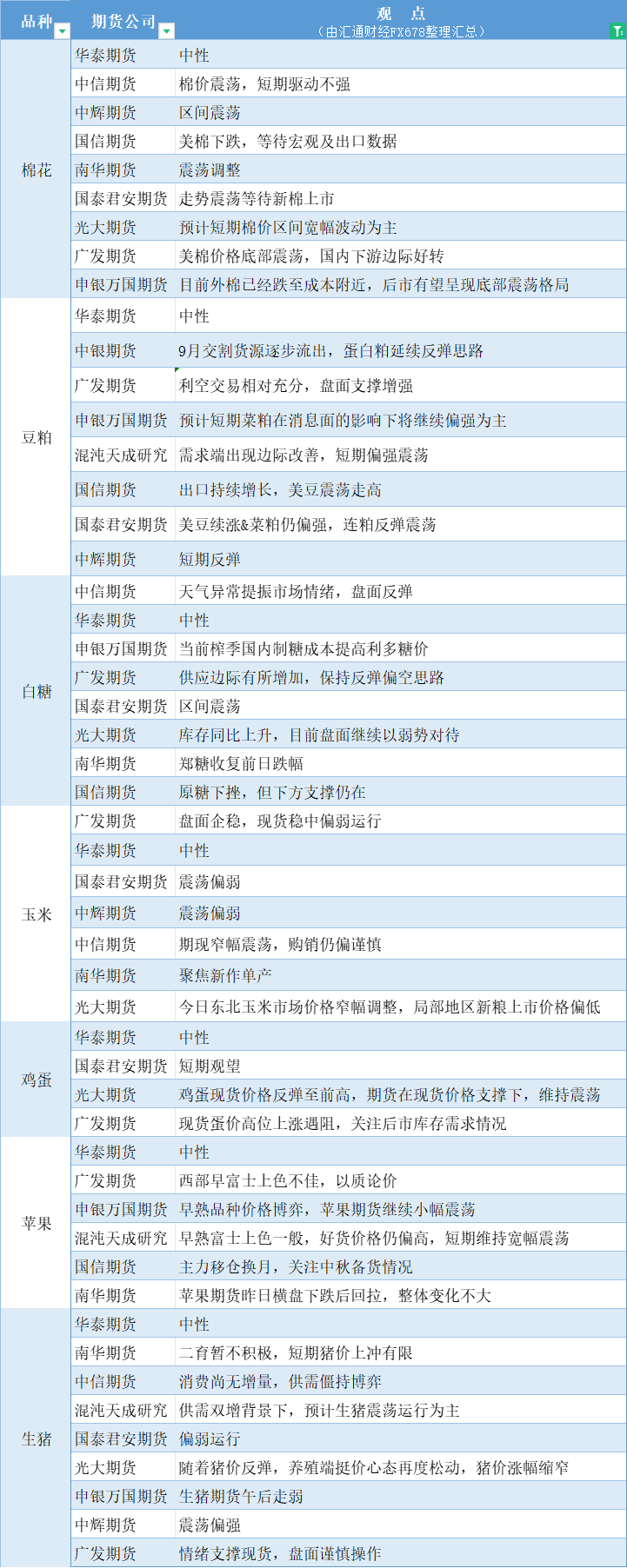 期货公司观点汇总一张图:9月6日农产品(棉花、豆粕、白糖、玉米、鸡蛋、生猪等)