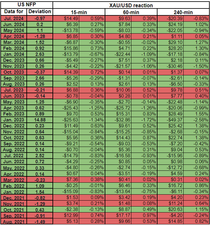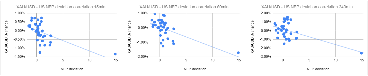 我们绘制了非农数据发布后的15分钟、1小时和4小时内的黄金价格反应。然后,我们将黄金价格的反应与实际非农结果与预期结果之间的偏差进行比较。