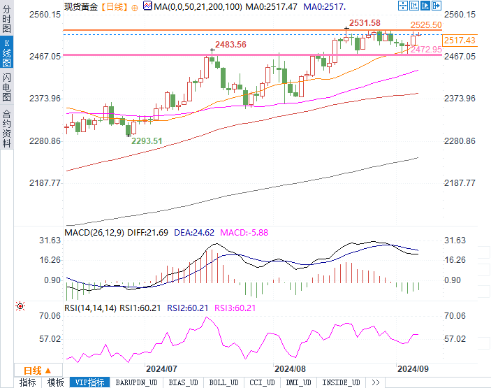 现货黄金价格基本持稳,最新报于2518美元/盎司附近。受市场对美联储鸽派立场的预期影响,美元表现疲软,推高了黄金的避险需求。周四发布的美国ADP就业数据逊于预期,进一步打压美元,助推黄金价格一度触及2523美元/盎司的高点。