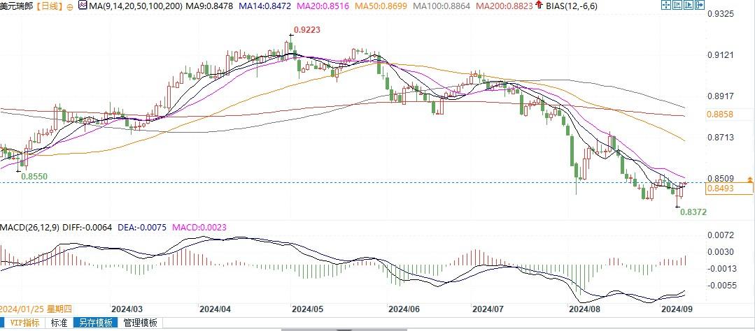 北京时间9月10日9:20,美元兑法郎报0.8494/96