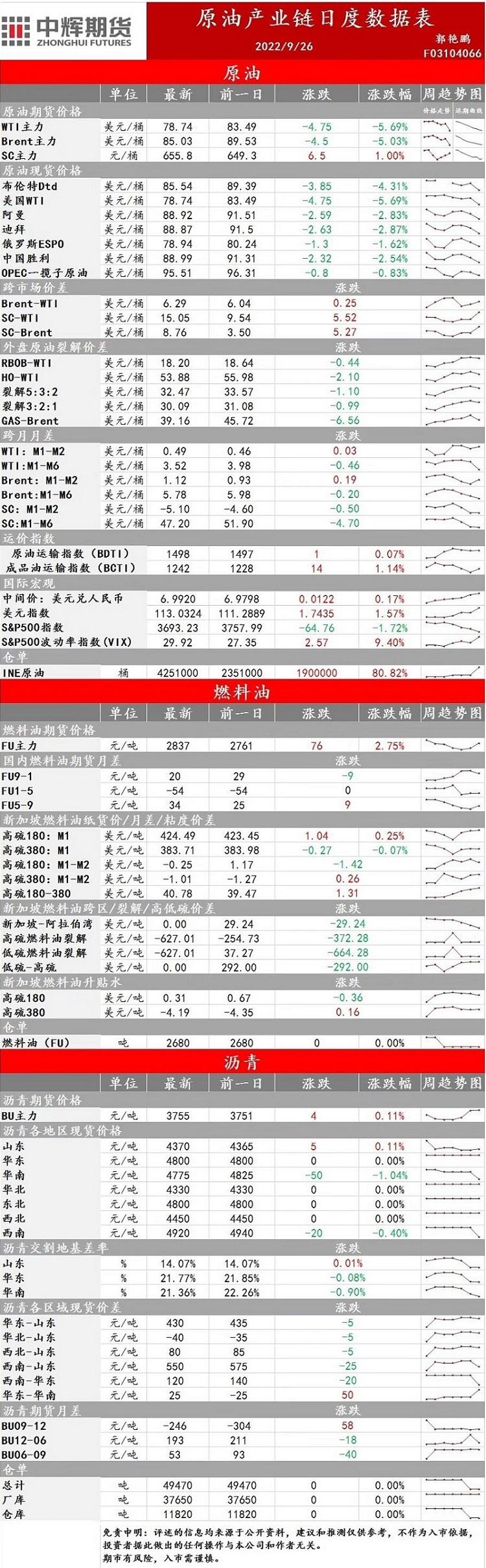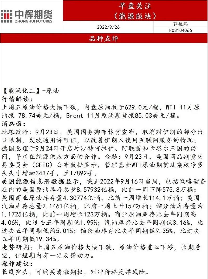 9月26日,中辉期货发布能源早盘关注,认为原油价格重心下移,长期看空,但短期内有一定反弹动力,长线空头,可购买看涨期权,对冲价格反弹风险。