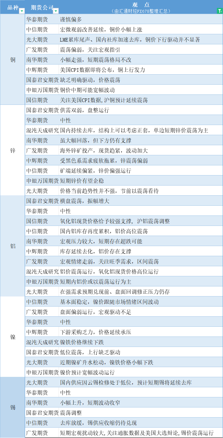 标题:期货公司观点汇总一张图:9月11日有色系(铜、锌、铝、镍、锡等)
