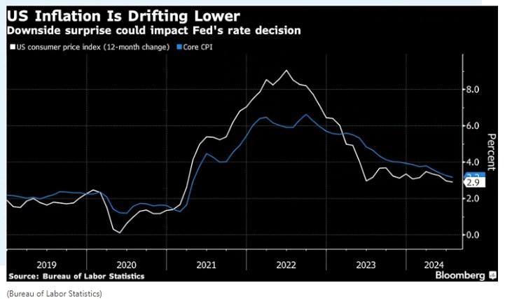 图:美国通胀走低(意外下行可能会影响美联储的利率决定)(白线是美国同比CPI,蓝线是核心CPI)