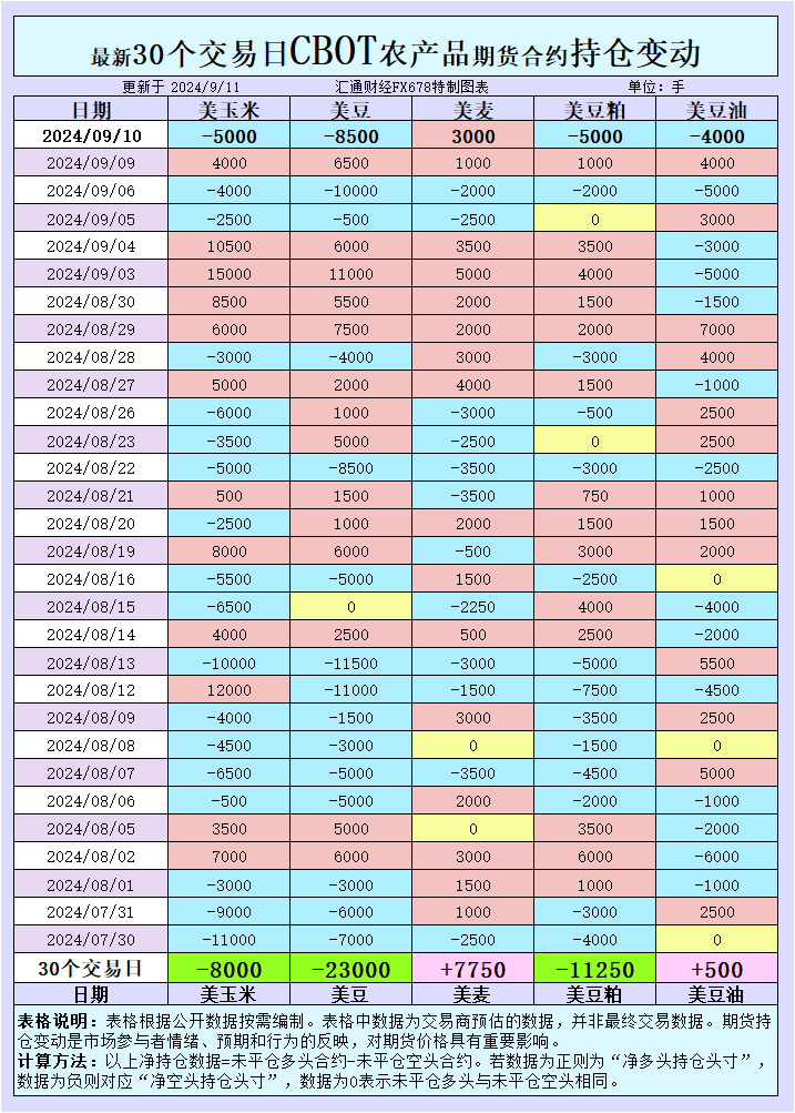 CBOT豆油期货价格同样面临压力,基金在9月10日增加了豆油期货的投机性净空头头寸。与豆粕相似,豆油的需求预期疲弱,而供应方面并没有出现足以支撑价格的紧张情况。