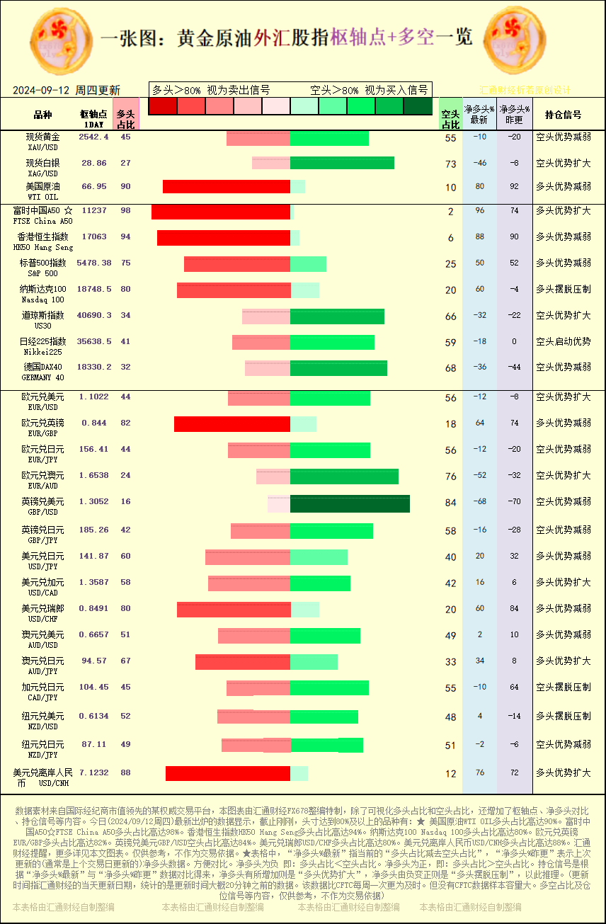 标题:一张图:2024/09/12黄金原油外汇股指"枢纽点+多空持仓信号"一览