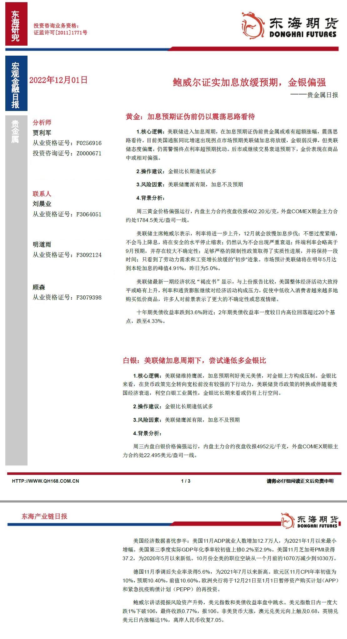 标题:【东海期货12月1日产业链日报】贵金属篇:鲍威尔证实加息放缓预期,金银偏强
