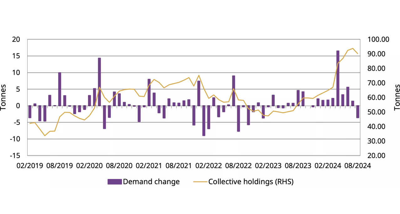 尽管环比季节性上升,但8月份的批发黄金需求仍然疲软。在该月,102吨黄金离开了SGE,环比增长14%。批发黄金需求往往在8月份随着季节性疲软的第二季度而回升:9月份的各种黄金首饰博览会和10月初国庆节销售高峰通常会提升8月和9月的黄金提货量。
