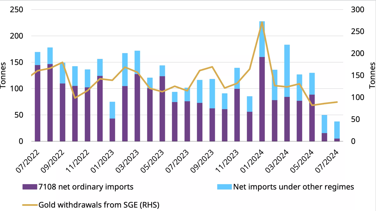 (黄金进口进一步下降,基于中国海关报告的所有HS编码7108下的进口,不包括出口。来源:中国海关,世界黄金协会)