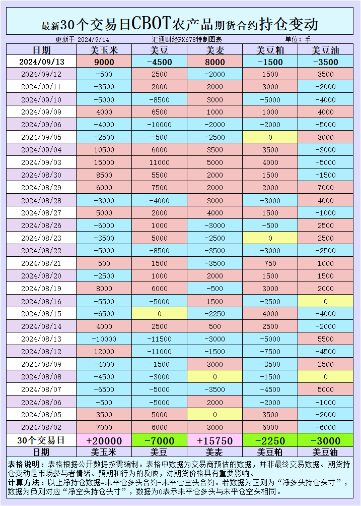 增加CBOT玉米投机性净多头;增加CBOT大豆投机性净空头;增加CBOT小麦投机性净多头;增加CBOT豆粕投机性净空头;增加CBOT豆油投机性净空头。
