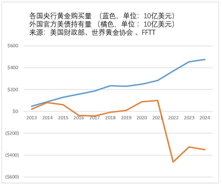 Luke Gromen,Forest for the Trees的创始人和总裁,用以下图表回应,指出“这一过程已经悄然进行了10年;在2022年对俄罗斯外汇储备实施制裁后,这一过程变得更加明显。”