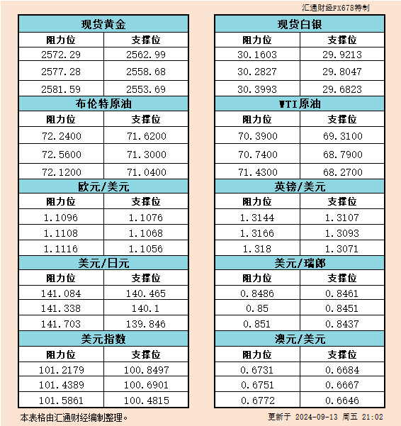 9月13日美市支撑阻力:金银原油+美元指数等六大货币对