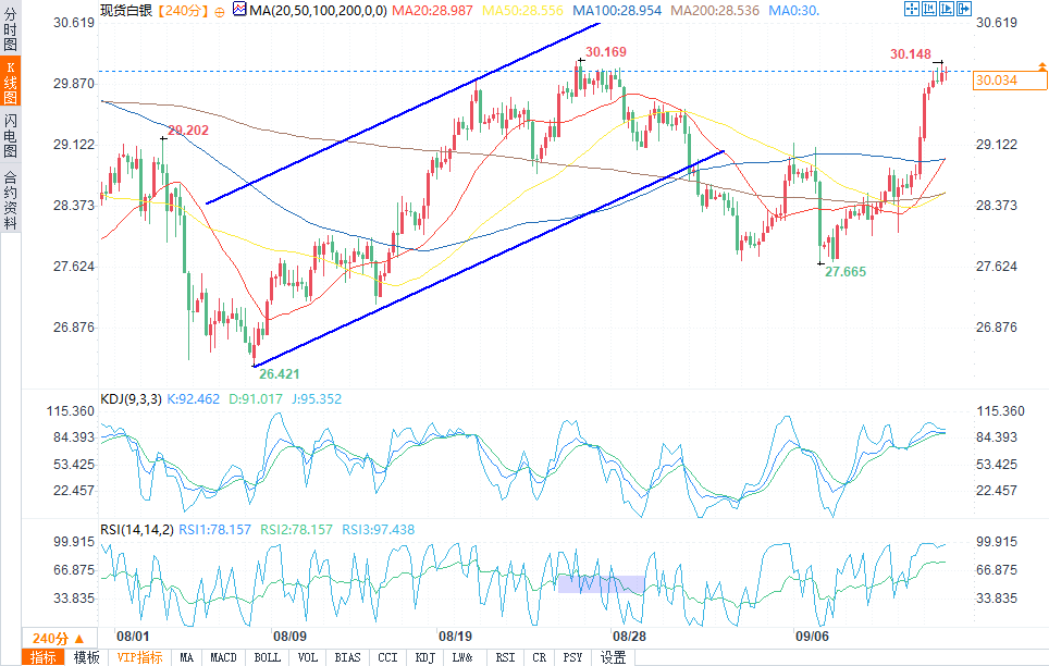 美元指数盘中下跌0.18%。美元走软使得白银对国际买家更具吸引力。美联储降息50个基点的押注从28%上升至41%,此前有报道称,更大幅度的降息仍是一种选择。这些报告引发了包括白银在内的大宗商品的新买盘。