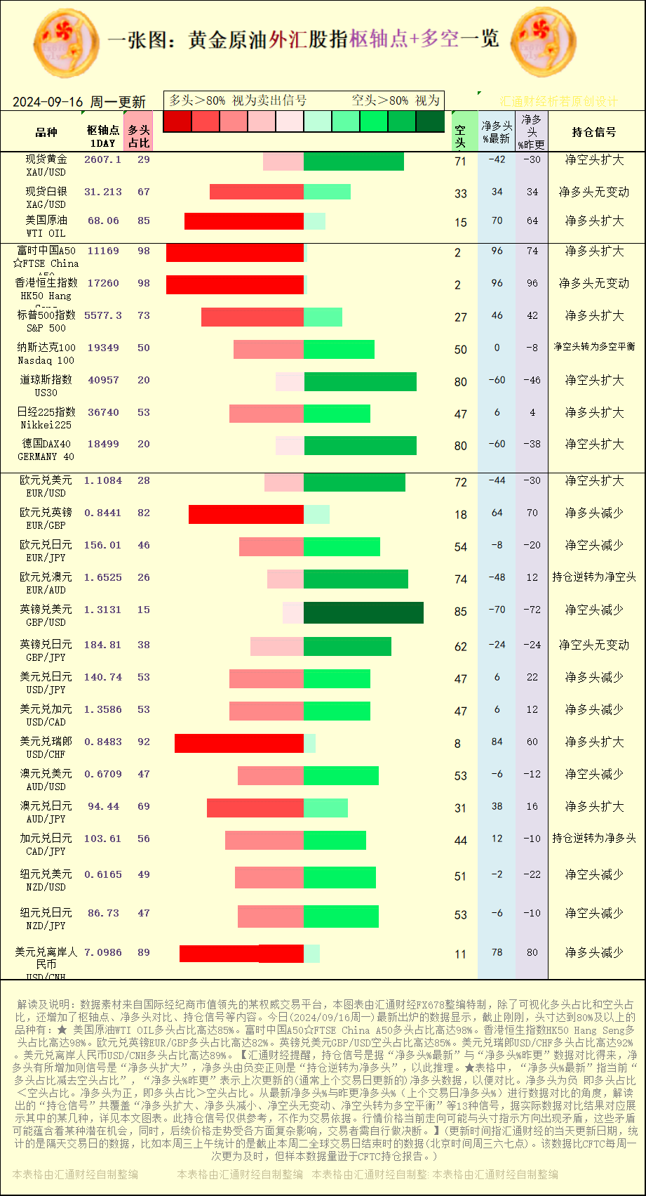 标题:一张图:2024/9/16黄金原油外汇股指“枢纽点+多空持仓信号”一览