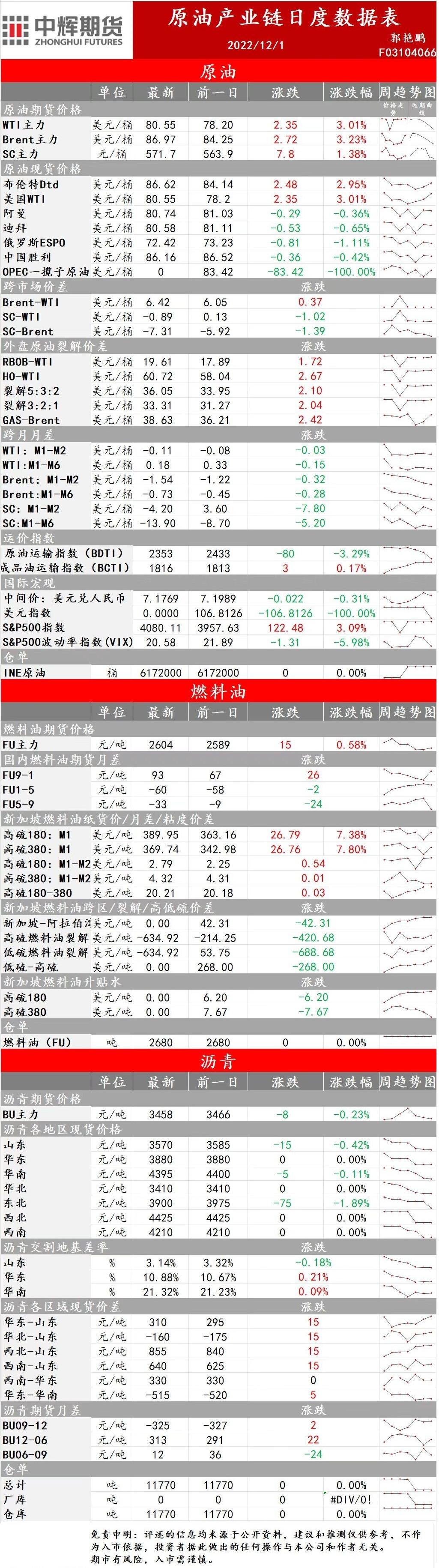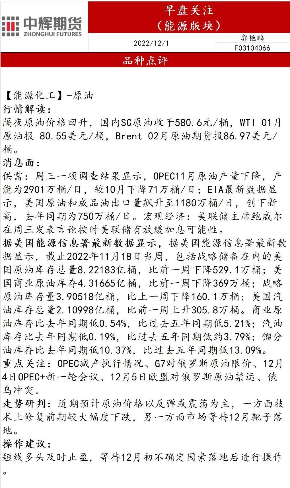 12月1日,中辉期货发布能源早盘关注,建议短线空头及时止盈,等待12月初各项不确定因素落地后进行操作。