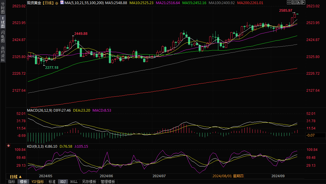 现货黄金高位震荡,目前交投于2578.94美元/盎司附近。上周五金价大幅上涨,创下纪录新高至2585.97美元/盎司,收报 2579.10美元/盎司,周线涨幅月3.29%,为4月初以来最大单周涨幅。分析师指出,对美联储即将降息的乐观情绪推动金价看涨动能,基金流入和美元下跌也起到了催化作用。最新数据显示,市场对美联储9月份降息50个基点的预期也有所升温。