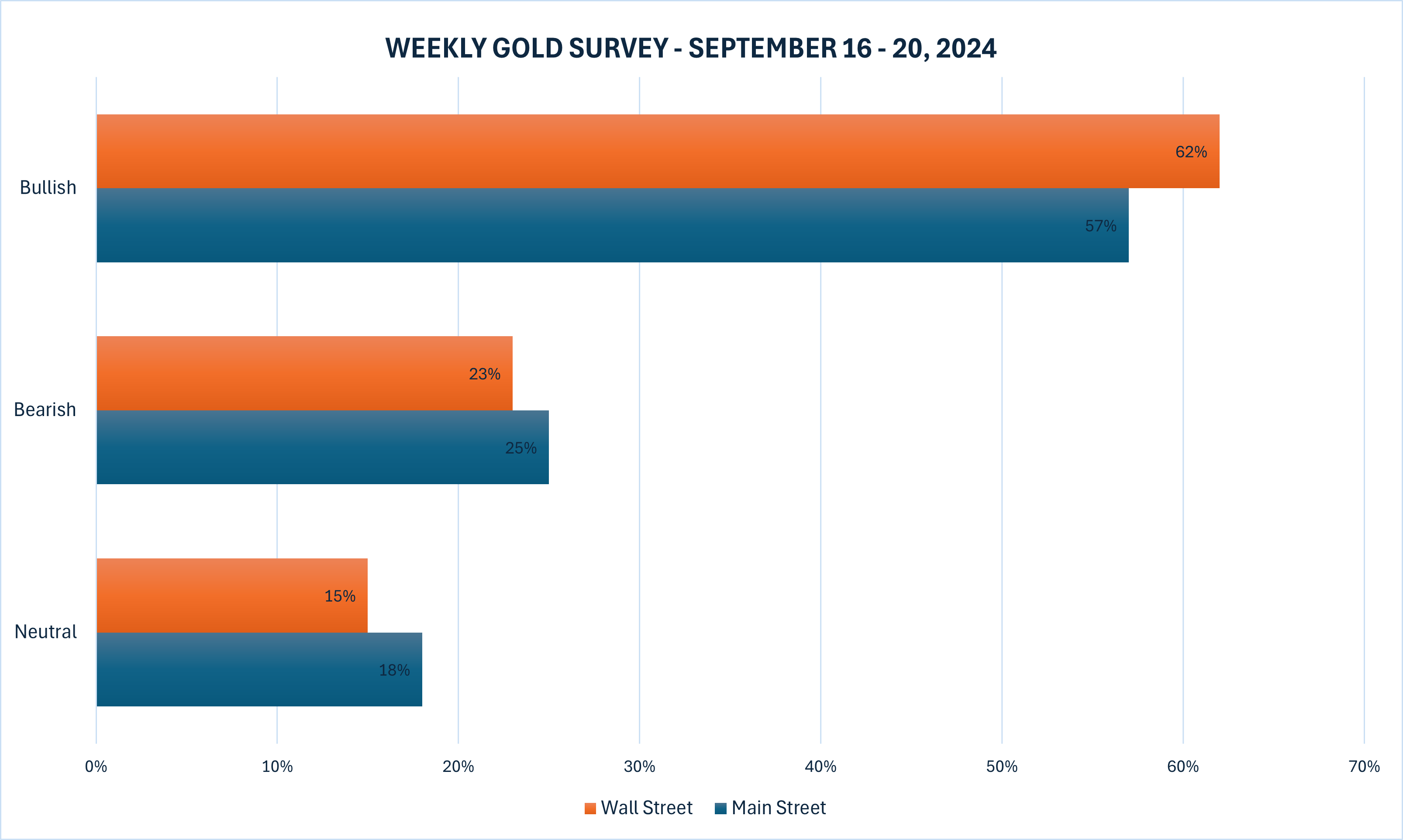 在上周的Kitco News黄金调查中,共有13位分析师参与,其中62%的专家预计黄金价格将在下周上涨,23%的分析师看跌,而15%的分析师预计价格将横盘整理。在线调查共有189名散户投资者参与,其中57%的投资者看涨,25%看跌,18%预计价格将横盘整理。