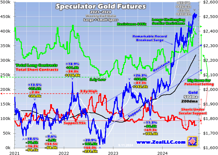 “近年来,这数字一直维持在41.5万份合约左右。尽管由于过度贪婪和兴奋,总投机多头可能会短暂飙升,但这种飙升会在几周内急剧逆转。一旦总投机多头触及并超过其长期阻力位,逆转的可能性就很大。投机者基本没有资金继续购买黄金期货,因此有更大的空间出售过度看涨的押注。”
