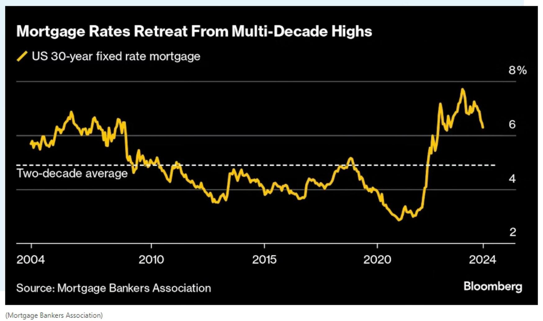图:抵押贷款利率从数十年高点回落(美国30年固定利率)(虚线是20年平均利率)