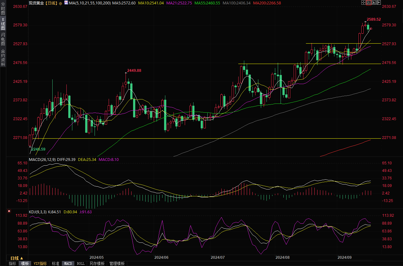 技术面来看,日线级别,金价在历史高位附近出现了类似“黄昏之星”的K线组合,这是一个见顶信号,如果不能快速再创新高,则意味着金价短线见顶,后市将迎来一波调整行情,如果回调力度较大,甚至会迎来一波下跌行情,投资者需要予以警惕。下方关注2550和8月20日高点2531.58附近支撑;上方留意2580和2600关口阻力。