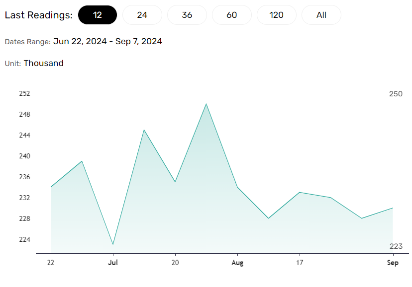 除了日本的数据外,美国劳动力市场数据也值得关注。经济学家预计,截至9月14日当周,首次申请失业救济人数将稳定在23万。