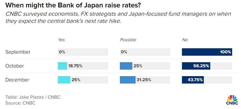 据CNBC国际调查显示,32名分析师预计日本央行周五将维持利率不变。10月和12月的调查结果反映出随着第四季度临近,不确定性程度很高。56.25%的受访者预计日本央行10月将维持利率不变,43.75%的受访者预计12月将维持利率不变。