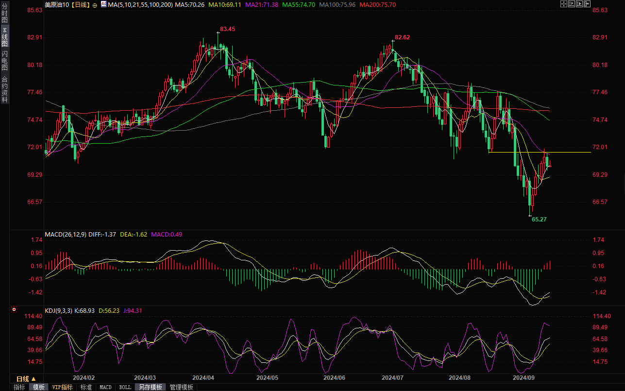 美原油10月期货目前交投于70.28美元/桶附近。自周二在71.46一线关键位置受阻后,