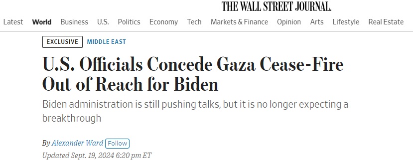 美国《华尔街日报》当地时间周四发布独家报道称,几个月来,美国高级官员一直说停火和人质释放协议近在咫尺,但现在他们私下承认,他们预计以色列和哈马斯不会在拜登总统任期结束前达成协议。