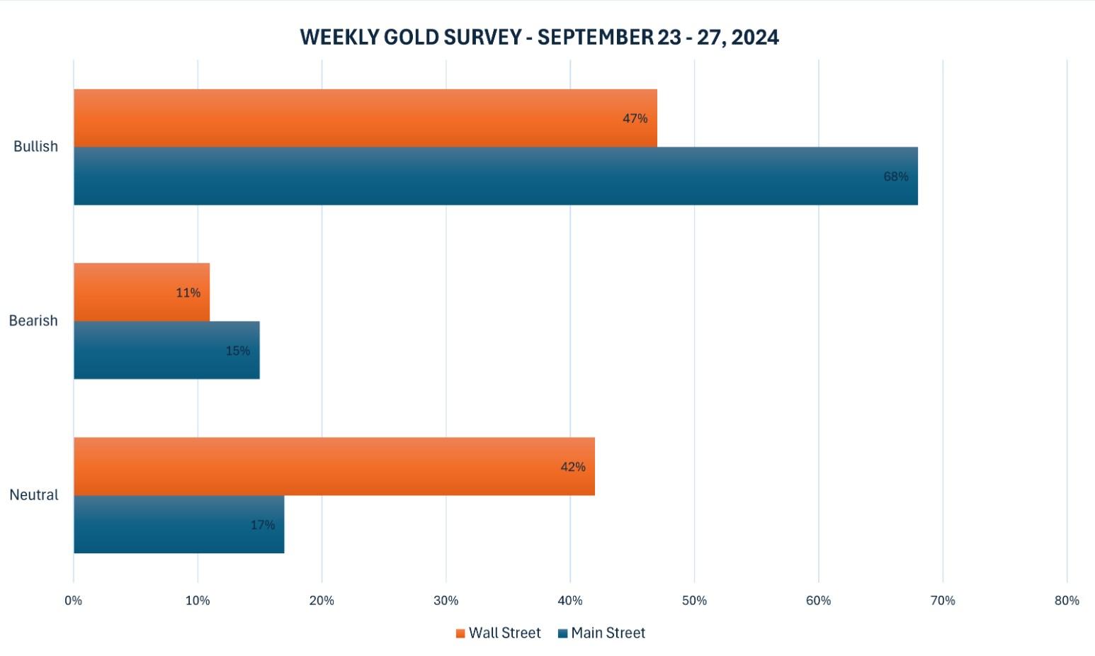 在Kitco News的黄金调查中,共有19位分析师参与,其中9位(占比47%)预计金价将上涨,8位(占比42%)预测金价将横盘整理,仅有2位(占比11%)认为金价将下跌。在线调查共有189票,其中129位散户投资者(占比68%)看多,29位(占比15%)看空,剩余31位(占比17%)预计金价将横盘整理。