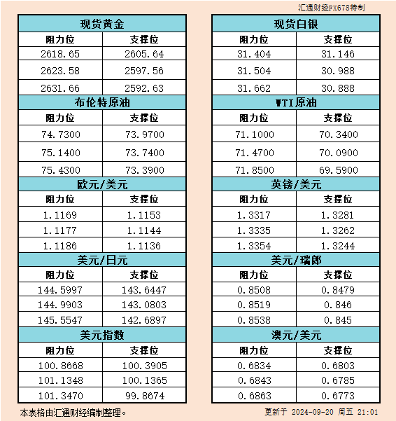 标题:9月20日美市支撑阻力:金银原油+美元指数等六大货币对