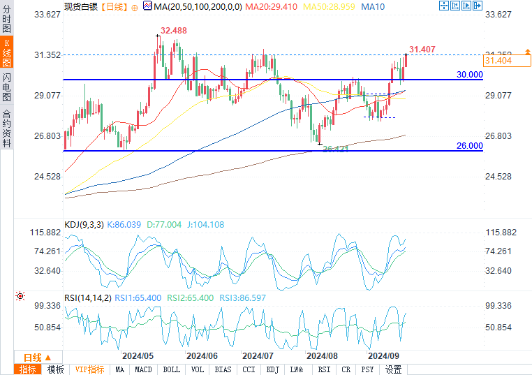 现货白银盘中报31.369美元/盎司,涨幅1.97%。