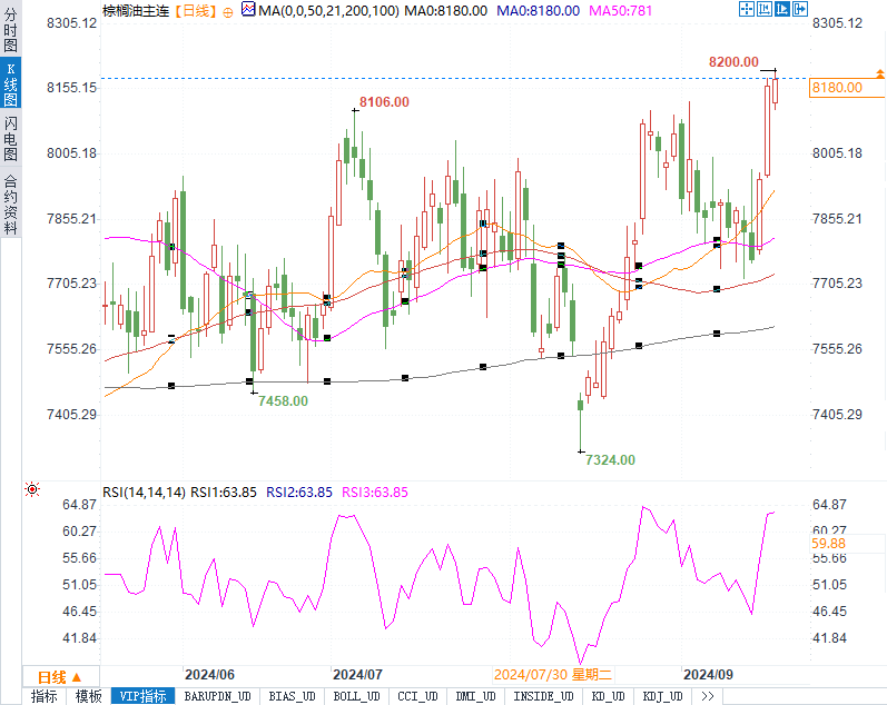 此外,大连期货交易所的数据显示,主力豆油合约上涨0.82%,棕榈油合约则上涨1.46%,而芝加哥期货交易所的豆油合约略微下跌0.05%。这些数据表明,棕榈油市场的走势受制于全球植物油市场的动态变化,尤其是在原油价格波动的背景下。