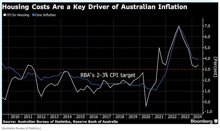 图:住房成本是澳大利亚通胀的一个关键驱动因素(白线:排除住房的CPI。蓝线:核心通胀。红色虚线:澳洲联储2%-3%的CPI目标水平)