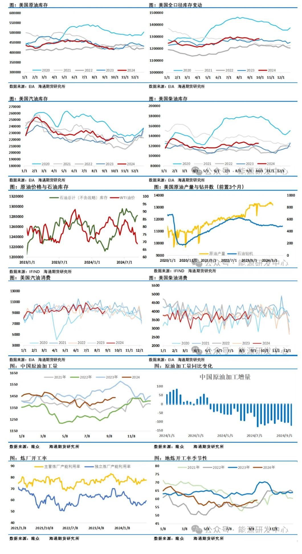最新一期EIA周度报告显示08月02日当周美国国内原油产量再次减少10万桶至1320万桶/日,产量下降与墨西哥湾飓风影响石油生产有直接关系,但可以看到美国原油产量今年回升速度以及明显变缓。此前EIA在9月短期能源展望报告中预计2024年美国原油产量将增加40.00万桶/日,此前为30.00万桶/日;预计2025年美国原油产量将增加40.00万桶/日,此前为50.00万桶/日。利比亚原油产销恢复也较为缓慢,原油出口目前仅为正常水平的一半。库存方面虽然库欣库存出现了连续的快速回落,美国原油商业库存压力也不大,但美国的石油总库存在近期还是反弹明显增长了12000桶,增幅约1%,增量主要来自于石油产品部分,这一反映出需求端表现不够强劲,EIA周度报告中上周汽柴油消费环比有所反弹,但与过去5年同期对比表现中规中矩;中国市场上周受国内中秋节假期影响原油加工量基本持平,明显低于去年同期,三季度加工量较去年同期少110万桶/日,加工量恢复缓慢的重要因素是终端消费疲弱,直接体现是国际原油价格反弹6美元的同期国内汽柴油价格出现了200元/吨的下跌,最新数据现实面对销售压力,周六国内成品油价格继续大幅下挫。