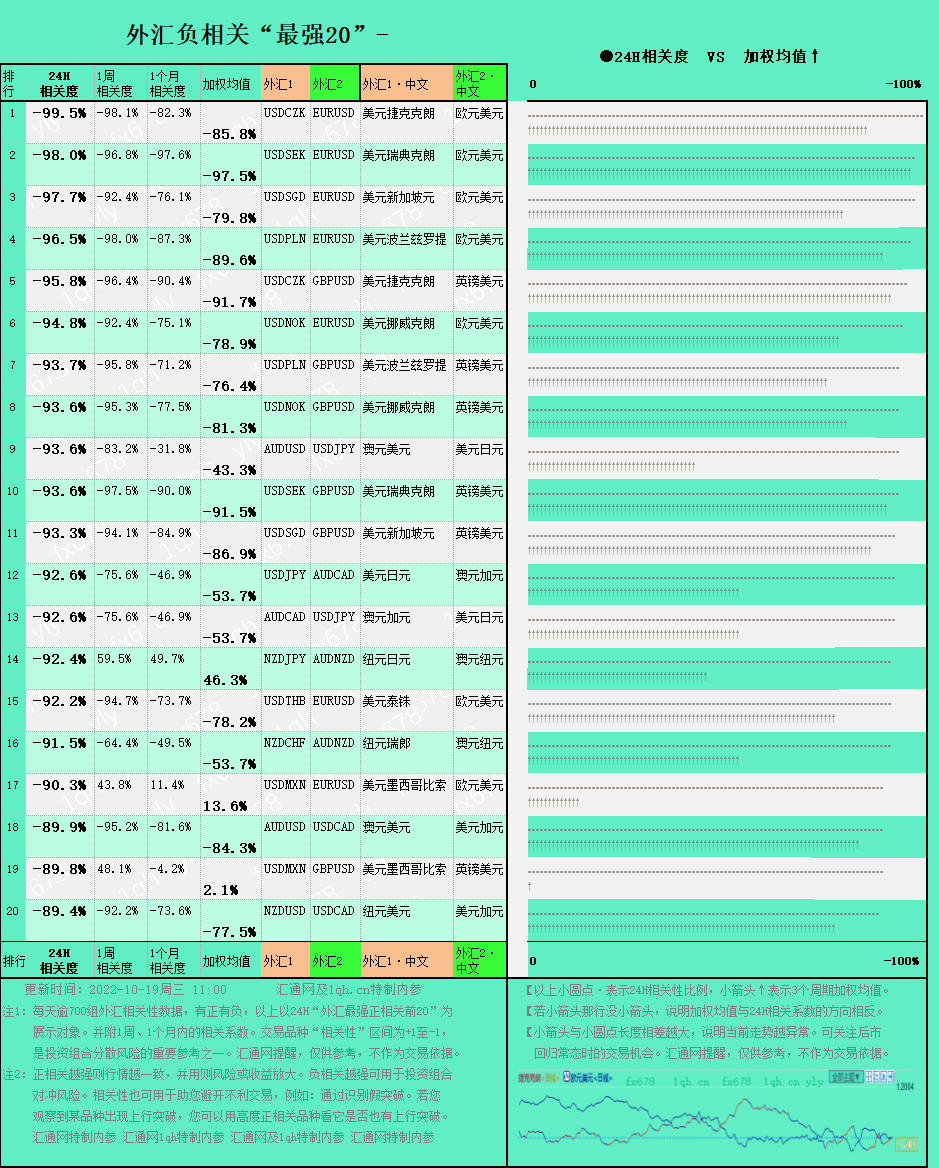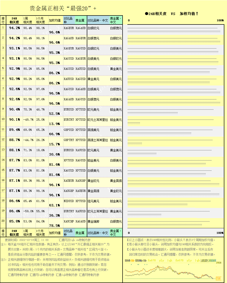 汇通财经APP讯——图解:外汇相关性+贵金属相关性一览,分以下四张图分别做对比展现。每天逾700组外汇或贵金属相关性数据,有正有负,以24H“外汇最强相关性前20”为排序,展示对象。并附1周、1个月内的相关系数。相关性也可用于助您避开不利交易,例如:通过识别假突破。