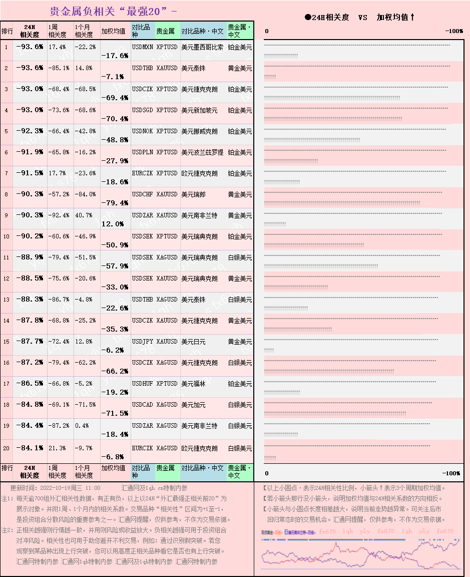 ★贵金属VS外汇的负相关最强前三个分别是:美元墨西哥比索(USDMXN) VS 铂金美元(XPTUSD)的“负相关”强度达到-93.60%。美元泰铢(USDTHB) VS 黄金美元(XAUUSD)的“负相关”强度达到-93.60%。美元捷克克朗(USDCZK) VS 铂金美元(XPTUSD)的“负相关”强度达到-93.00%。汇通网提醒,更多参考本文如下表格。