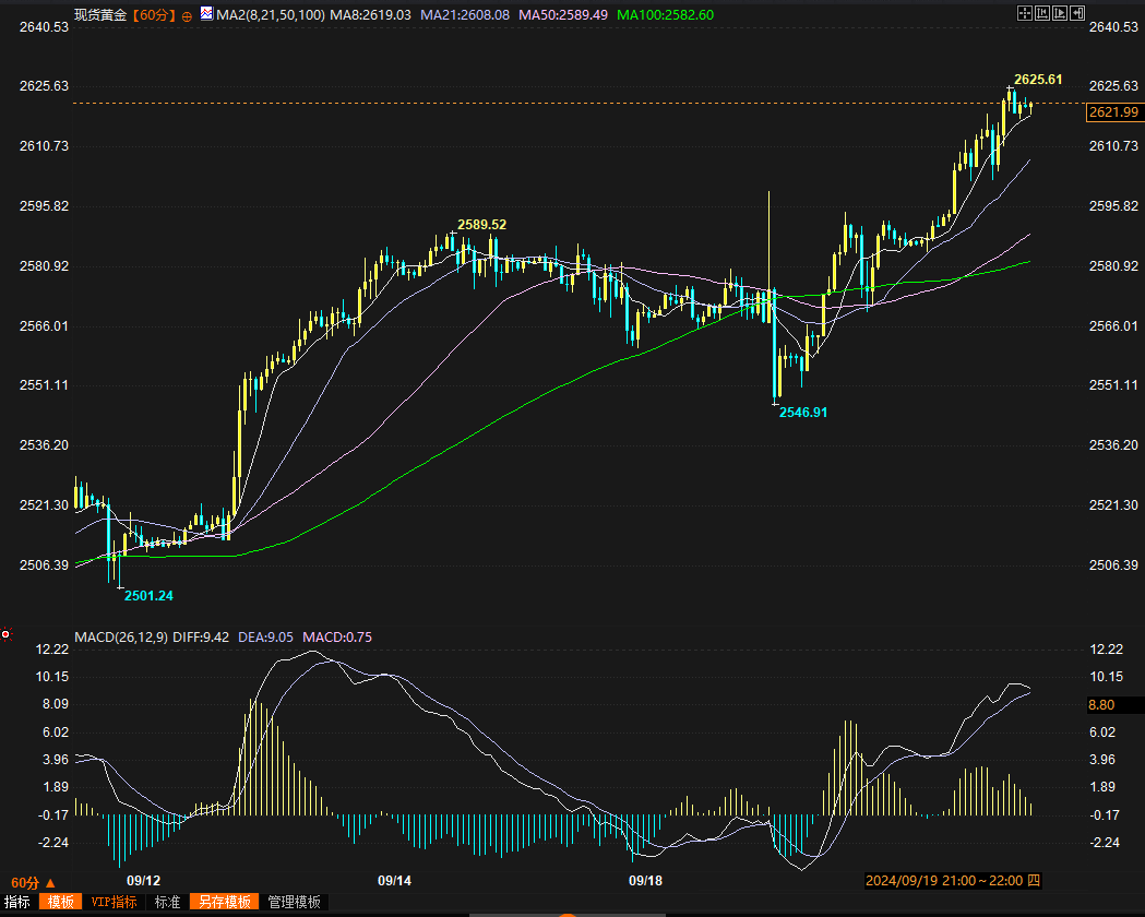 小时图看,金价MACD临近高位朝下死叉,不过这种高位死叉随时可能缠绕住而让价格继续上涨。K线看,金价在历史新高2625.61后出现了一根大阴线,之后三根K线显示空头并未取得进展,多头貌似重新站稳,可以看到最近两根阳线K线刚好踩在小时图8均线切入位上。加上周末消息显示中东局势似有升级风险,预计金价周一(9月23日)有望冲高,阻力重点关注2650。由于在日图级别正在受到上述黄色实线的压制,因此预计冲高发力后可能会触发空头暴击,如果金价出现明显的回落,预计重点支撑在2600关口。此点位可能会触发新一轮涨势,如果中东局势进一步恶化,不排除黄金测试2700大关的可能性。